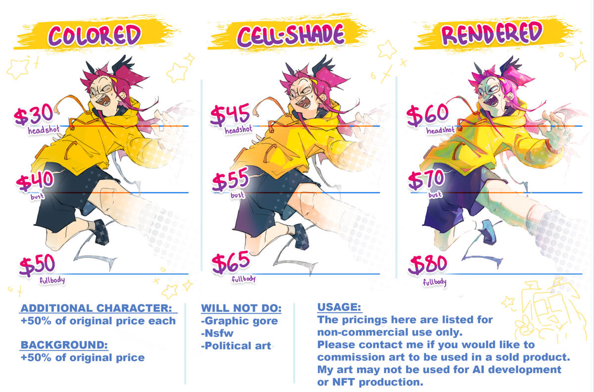 Contact me at MariExists on discord (preferred) or [email protected] for commissions!Prices are subject to change depending on piece complexity. Payment will be done upfront through PayPal.日本語もOKです!